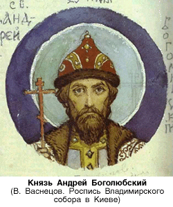 Андрей Боголюбский (не ранее 1100-1174), великий князь владимирский (с 1157). Сын князя Юрия Долгорукого. Помогал отцу в борьбе за Киев (с 1149), княжил в Вышгороде, Турове и др. Самовольно покинул Вышгород в 1155 и обосновался во Владимире-на-Клязьме. После смерти отца (1157) стал князем владимирским, ростовским и суздальским. Андрей Боголюбский пытался объединить под своей властью русские земли. Лишил владений и изгнал в Византию своих родственников. С 1159 упорно боролся за подчинение Новгорода своей власти. В 1169 войска Андрея Боголюбского взяли Киев и подвергли его страшному погрому. Он Перенёс столицу во Владимир, укрепил его и построил великолепный Успенский собор и другие церкви и монастыри. В это же время под Владимиром вырос укрепленный княжеский замок Боголюбове, по названию которой он и получил свое прозвище. В правление Андрея Боголюбского Владимирско-Суздальское княжество являлось самым могущественным на Руси. Усиление княжеской власти вызвали заговор, в котором участвовали видные бояре и приближенные князя. В ночь с 28 на 29 июня 1174 г. Андрей Боголюбский был убит в своей резиденции Боголюбово. Канонизирован Русской Православной церковью.