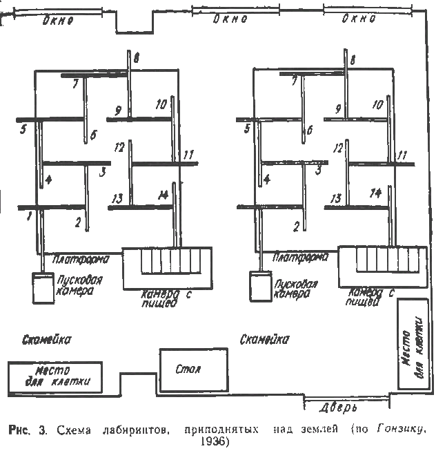 Представим схему двух типичных лабиринтов: лабиринта с корридорами (рис. 2) и приподнятого над землей лабиринта (рис. 3). В типичном эксперименте голодная крыса помещается у входа в лабиринт (одного из этих типов), она блуждает по различным его участкам, заходит в тупики, пока, наконец, не придет к кормушке и будет есть. Один опыт (опять в типичном эксперименте) повторяется через каждые 24 ч, животное имеет тенденцию делать все меньше и меньше ошибок (ими являются, заходы в тупик) и тратить все меньше и меньше времени от старта до цели до тех пор, пока, наконец, оно совсем не заходит в тупики и пробегает весь путь от старта до цели за несколько секунд. Результаты обычно представляются в виде кривой с изображением заходов в тупики или времени от старта до финиша для группы крыс.