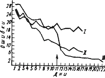 Рис. 7. Кривая ошибок для I, II, III групп крыс (по Толмену и Гонзику, 1930)