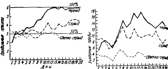 Эта приемлемая интерпретация появилась в дальнейшем, в результате экспериментов моих и Миниема, в которых группа из крыс была сначала обучена дифференцировке белого и черного, затем двум возрастающим по трудности дифференцировкам серого и черного. Для каждого из этих случаев крысам давались длиные серии дополнительных проб после того, как они уже научились. Сравнение этих начальных стадий опытов показывает, что крысы делали больше викарных проб в ситуации простого различения, чем более трудного. Однако, когда переходили к сравнению количества викарных проб, которые животное делает в конце каждого из этих опытов, наблюдались противоположные результаты. Иными словами, после того как крысы, наконец, угадывали свои инструкции, они, подобно человеческому субъекту, делали тем больше викарных проб, чем более трудным было различение.