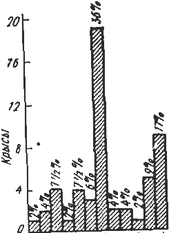 Тогда они возвращались на круглую площадку и начинали исследовать практически все радиальные участки. После захода в любой участок только на несколько сантиметров каждая крыса выбирала наконец один, который пробегала весь. Процент крыс, окончательно выбирающих один из длинных участков (от 1-го до 12-го), представлен на рис. 18. Кажется, что преобладающей тенденцией был выбор участка № 6, который находился всего на 4 дюйма впереди от участка, имеющего выход к кормушке. Был еще только один участок, который выбирался с некоторой заметной частотой. Это участок № 1, тот, который был расположен перпендикулярно к стороне, на которой находилась пища.