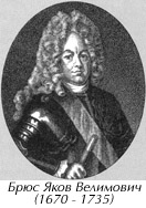 Брюс Яков Вилимович (1670-1735) - граф (1721), сподвижник Петра I. Происходил из знатного шотландского рода, военный, географ и дипломат. Руководил Новгородским приказом, командовал русской артиллерией в Северную войну. Сенатор. От имени России подписал в 1721 г. Ништадтский мир. С 1717 по 1722 г.г. президент Берг - коллегии. Много сделал для организации металлургического и военного производства, в частности на Урале. Занимался математикой, физикой, астрономией. Составлял и редактировал географические карты и глобусы. Владея несколькими языками, делал переводы иностранных научных трудов на русский язык. Внес большой вклад в развитие отечественной артиллерии. С 1706 г. ведал московской типографией.