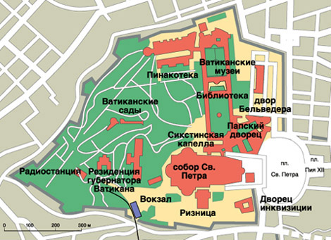 Ватикан - государство - город (часть г. Рима), центр римско-католической церкви, резиденция главы римской католической церкви - папы. Площадь 44 га., население - 1000 чел. Имеет свои денежные знаки, радиостанцию, тюрьму. Вооруженные силы Ватикана состоят из немногочисленной гвардии, жандармерии (карабинеров) и личной охраны папы. Государство существует в границах, определенных Латеранским соглашением, заключенным папой Пием XI с фашистским правительством Муссолини в 1929 г. Ватикан поддерживает дипломатические отношения с рядом стран. Верховной властью (законодательной, судебной, исполнительной) в государстве обладает папа.