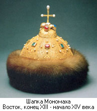 Шапка Мономаха (корона российских самодержцев) - головной убор с собольей опушкой, украшенный драгоценными камнями и крестом (XIV в.). Символ самодержавной власти в России. В конце XV - начале XVI в. возникла легенда о том, что византийский император Константин Мономах прислал своему внуку великому киевскому князю Владимиру Мономаху (1113 - 1125 гг.) шапку (символ императорской власти). По мнению Мономашичей (правителей Руси), это давало им право на титул "царь" (цезарь в Римской империи).
