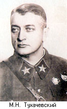 Тухачевский Михаил Николаевич (1893-1937 гг.) - советский военачальник, Маршал Советского Союза (1935 г.). Родился под Смоленском в семье небогатого помещика. С детства решил стать военным, но только в 18 лет поступил в Московский кадетский корпус, который окончил с отличием, и был занесен на мраморную доску первых учеников. Продолжил учебу в Московском Александровском военном училище, окончил его в 1914 г. одним из первых учеников. В то время у первых учеников была привилегия самим определять себе место дальнейшей службы, и М.Н. Тухачевский выбрал лейб-гвардии Семеновский полк, служба в котором считалась чрезвычайно престижной и в котором в начале XIX в. служили два его предка. Верноподданнических чувств никогда не обнаруживал, по признанию его сестер Елизаветы и Ольги, с юности отличался вольномыслием и независимостью суждений. 19 июля 1914 г. началась 1-я мировая война. Война требовала доблести, мужества, а этого у 20-летнего подпоручика (младшего офицера) было, хоть отбавляй. В сражениях проявлял большое личное мужество, всего за полгода получил шесть боевых орденов: "Святой Анны" 4-й, 3-й и 2-й степени, "Святого Станислава" 3-й и 2-й степени, "Святого Владимира" 4-й степени. 19 февраля 1915 г. в Восточной Пруссии между Сувалками и Августовым попал в немецкий плен. В плену узнал о Февральской революции, с пятой попытки ему удалось бежать. В Петроград вернулся в дни Октябрьской революции, восстановился в своем Семеновском полку, но большевики упразднили царскую армию, и молодой подпоручик остался не у дел. Однако вскоре большевикам пришлось создавать Красную Армию, своих офицерских кадров не было, и они стали привлекать на военную службу офицеров царской армии. М.Н. Тухачевский без военной службы себя не мыслил, в начале апреля 1918 г. поступил на службу в Красную Армию, сразу же (5 апреля 1918 г.) вступил в РКП (б). Началась блестящая и трагическая судьба красного маршала М.Н. Тухачевского. Вскоре он был назначен в Военный отдел ВЦИК, с мая 1918 г. стал военным комиссаром обороны Московского района. В июне 1918 г. молодой 24-летний подпоручик был назначен командующим 1-й армией на Восточном фронте (июнь 1918-нач. января 1919 г.), что вызывало недоумение белых генералов. В январе-марте 1919 г. командовал 8-й армией Южного фронта, с апреля по ноябрь 1919 г. - 5-й армией. За бои при разгроме войск А.В. Колчака награжден орденом Красного Знамени (1919 г.) и Почетным революционным оружием (1919 г.). С февраля по апрель 1920 г. командовал Кавказским фронтом, с апреля 1920 до марта 1921 г. - Западным фронтом. М.Н. Тухачевский на фронтах гражданской войны одерживал блестящие победы, но в августе 1920 г. во время советско-польской войны (апрель - октябрь 1920 г.) под Варшавой его войска были разгромлены поляками. В 1921 г. его 7-я армия подавляла Кронштадтский мятеж; в мае 1921 г. командовал войсками Тамбовского района при подавлении крестьянского восстания под руководством А.С. Антонова. В 1922-1924 гг. М.Н. Тухачевский командовал войсками Западного округа. В 1924 г. он был назначен помощником заместителя председателя РВС Республики М.В. Фрунзе, а с 1925 по 1928 гг. начальником штаба РККА. С мая 1928 г. по 1931 гг. командовал войсками Ленинградского военного округа. Летом 1931 г. был назначен заместителем наркома обороны и начальником вооружений РККА. С 1934 - 1-й заместитель наркома обороны СССР К.Е. Ворошилова. В это время в высшем военном руководс