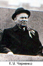 Черненко Константин Устинович (1911-1985 гг.) - генеральный секретарь ЦК КПСС и председатель президиума ВС СССР с 1984 г., Герой Социалистического Труда (1976, 1981, 1984 гг.), Лауреат Ленинской премии (1982 г.). Родился в семье Большая Тесь Красноярского края в семье крестьянина. С юности занимался общественной работой. В 1941-1943 гг. К.У. Черненко работает секретарем Красноярского крайкома, в 1945-1948 гг. - Пензенского обкома партии. Одновременно окончил в 1945 г. Высшую школу партийных организаторов, в 1953 г. Кишиневский педагогический институт. С 1948 г. работал в аппарате ЦК КП Молдавии. В 1956 г. его переводят в Москву по инициативе покровителя Л.И. Брежнева. В 1956 -1960 гг. - в аппарате ЦК КПСС. Аккуратный, исполнительный К.У. Черненко поставил в аппарате ЦК делопроизводство на высокий уровень. В 1960-1965 гг. - в Президиуме Верховного Совета СССР. В 1965-1982 гг. зав. отделом, одновременно с 1976 г. секретарь ЦК КПСС. Член Политбюро ЦК КПСС с 1978 г. Пост Генерального секретаря занял в 1984 г., будучи смертельно больным человеком, сил на активную деятельность у него не хватало.
